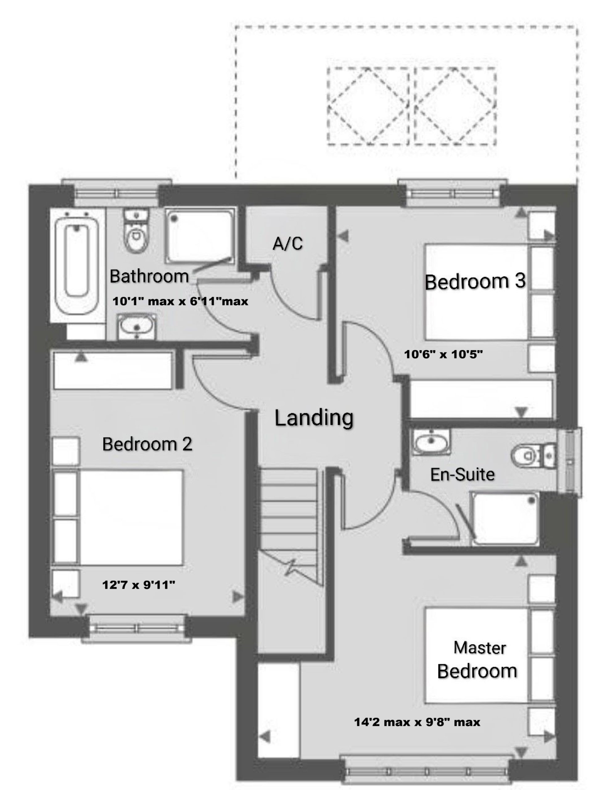 - Landing, three bedrooms including principal bedroom with en-suite shower