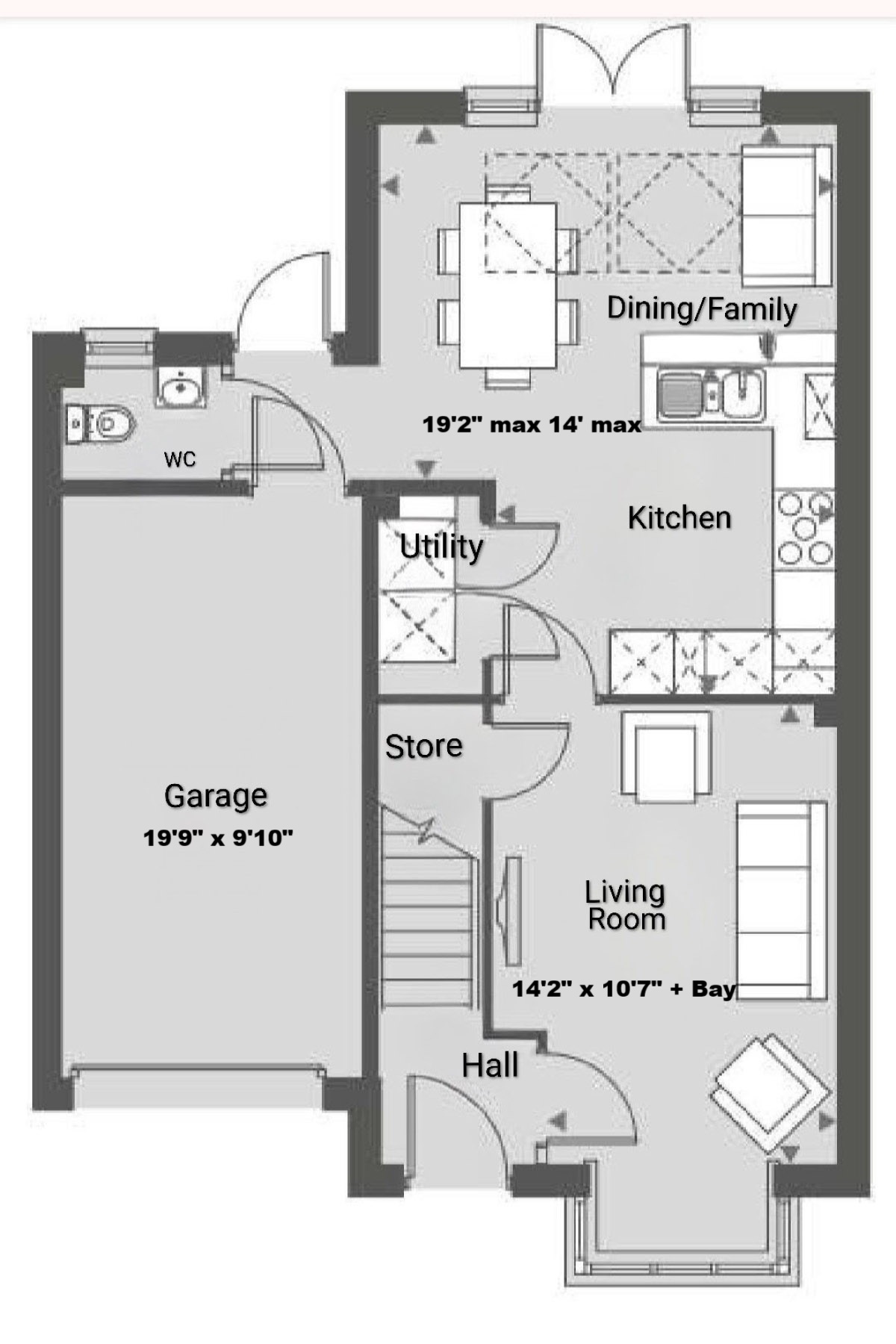 Ground Floor: Front entrance lobby, sitting room, open-plan fitted kitchen/dining/family room with double doors leading to the rear garden, inbuilt utility room, cloakroom, and integral garage.